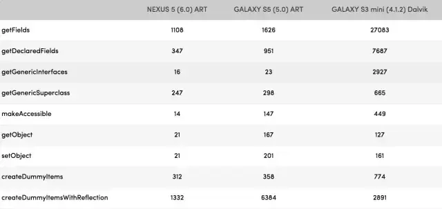 显然,在Android中使用反射非常慢,使用反射的测试执行分别需要1332毫秒、6384毫秒、2891毫秒,而不使用反射则只需要312毫秒、358毫秒、774毫秒。一个有趣的现象是,安卓5.0 ART环境下,高端设备使用反射耗费的时间,比安卓4.1 Dalvik环境下的低端设备更长,只有安卓6.0 ART环境才提升了反射的性能,但是反射仍然非常慢。