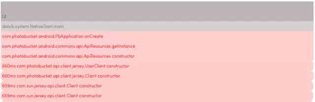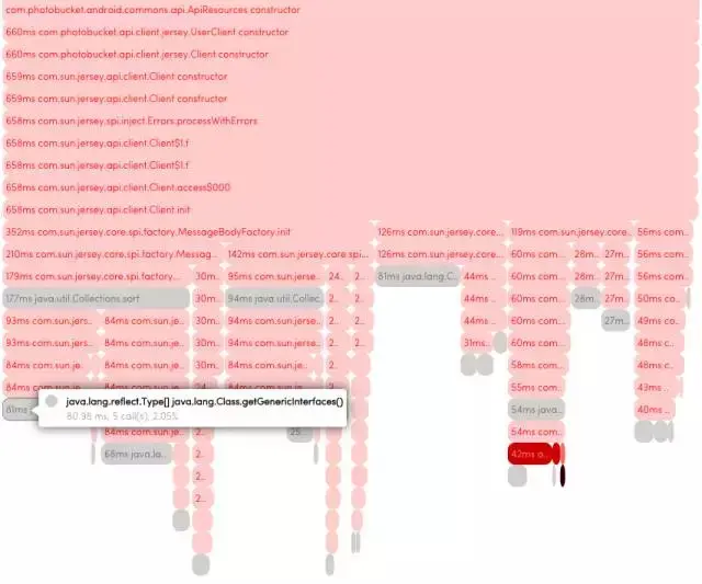 我们可以看到构造 com.photobucket.api.client.jersey.UserClient 花费了660毫秒。进一步分析冰柱图,我们可以看到延迟的来源是对反射的使用: