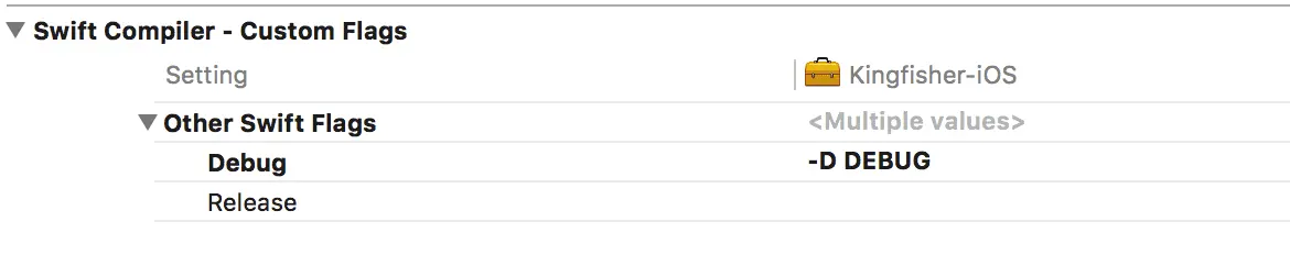 在调试程序时,很多开发者喜欢用输出 log 的方式对代码的运行进行追踪,帮助理解。Swift 编译器并不会帮我们将 print 或者 debugPrint 删去,在最终 app 中它们会把内容输出到终端,造成性能的损失。我们当然可以在发布时用查找的方式将所有这些 log 输出语句删除或者注释掉,但是更好的方法是通过添加条件编译来将这些语句排除在 Release 版本外。在 Xcode 的 Build Setting 中,在 Other Swift flags 的 Debug 栏中加入 -D DEBUG 即可加入一个编译标识。