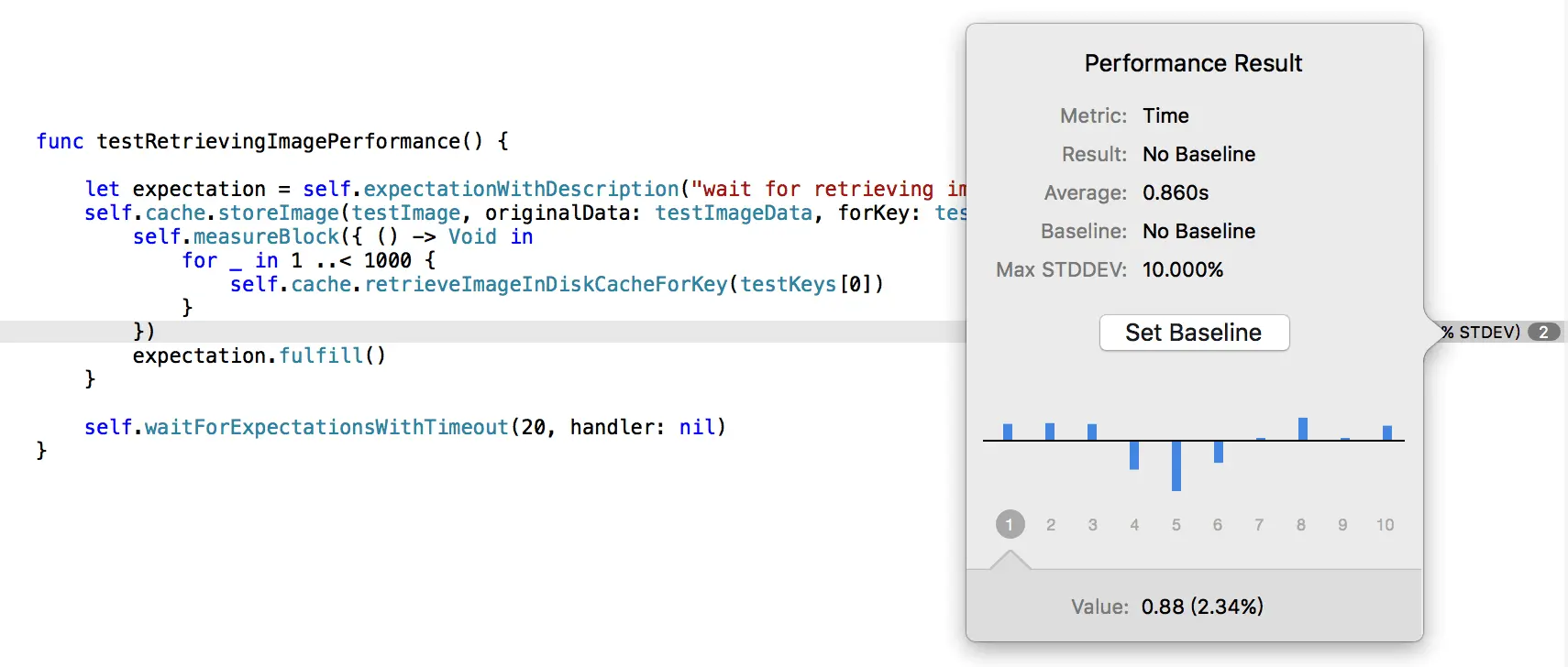 当我们寻找到需要进行优化的代码路径后,为其建立一个单元测试来持续地检测代码的性能是很好的做法。在 Xcode 中默认的测试框架 XCTest 提供了检测并汇报性能的方法:measureBlock。通过将测试的代码块放到 measureBlock 中,Xcode 在测试时就会多次运行这段代码,并统计平均耗时。更方便的是,你可以设定一个基准,Xcode 会记录每次的耗时并在性能没有达到预期时进行提醒。这保证了随着项目开发,关键的代码路径不会发生性能上的退化。