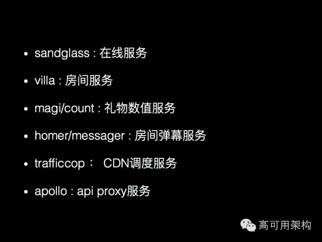 熊猫 TV 是一家视频直播平台,先介绍下我们系统运行的环境,下面这 6 大服务只是我们几十个服务中的一部分,由于并发量与重要性比较高,所以成为 golang 小试牛刀的首批高性能高并发服务。