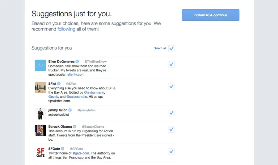 例如,Twitter为了强化习惯路径,在新手引导流程中建议新用户可以关注的人。一旦确定某个路径能促进用户路转粉,你也会想做类似的事情。