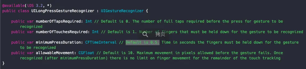 长按手势的默认属性中,有一个 minimumPressDuration 默认值是 0.5,也就是说,在长按了0.5秒时,我们自定义的长按手势执行方法和系统的冲突了,于是解决方法显而易见:把自定义长按手势的反应时间缩短到0.5s以内,这样就可以在系统方法执行之前完成操作,而事实上,你甚至可以简单粗暴地把它改为0.1s,依然不会和点按的 Tap 手势有冲突。