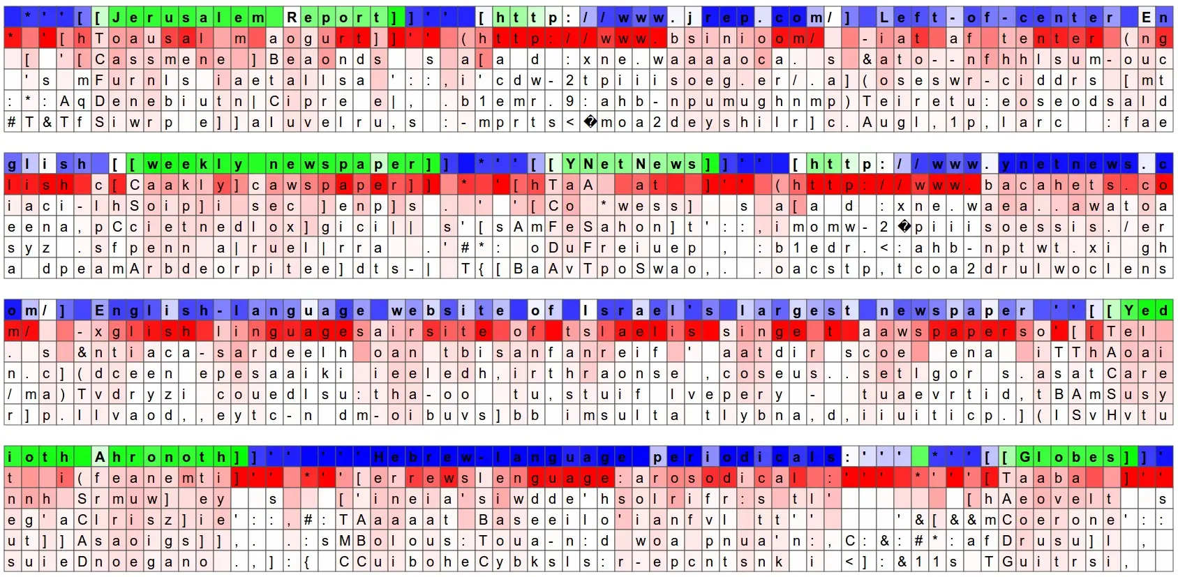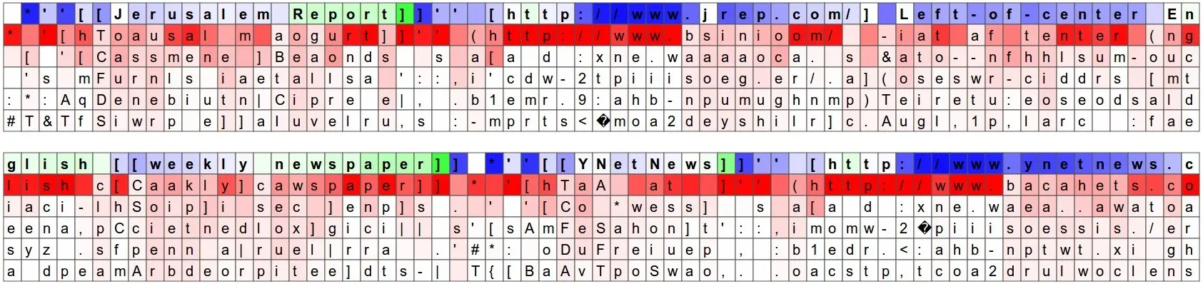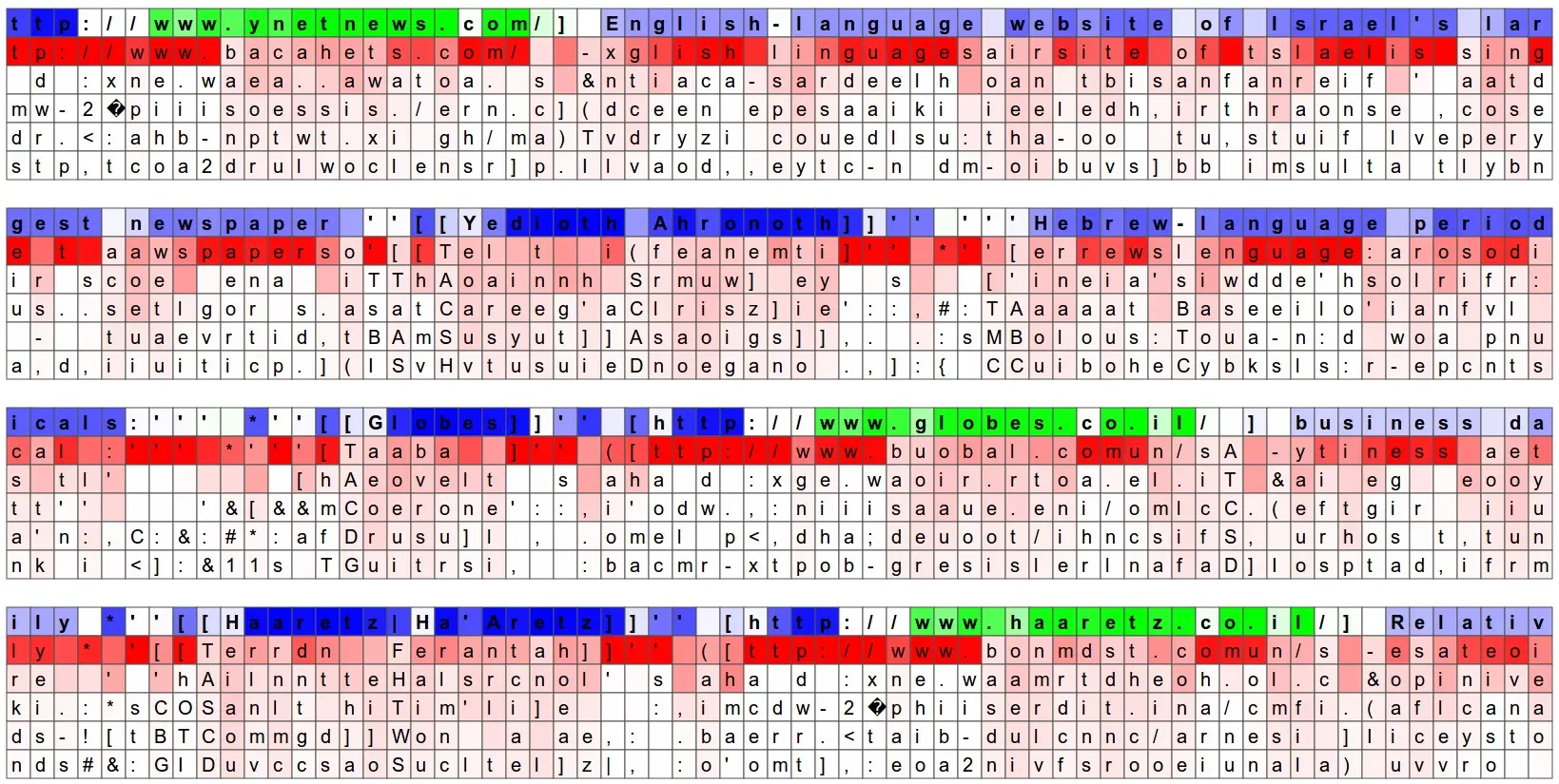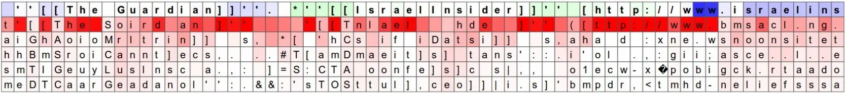Another fun visualization is to look at the predicted distributions over characters. In the visualizations below we feed a Wikipedia RNN model character data from the validation set (shown along the blue/green rows) and under every character we visualize (in red) the top 5 guesses that the model assigns for the next character. The guesses are colored by their probability (so dark red = judged as very likely, white = not very likely). For example, notice that there are stretches of characters where the model is extremely confident about the next letter (e.g., the model is very confident about characters during the http://www. sequence).