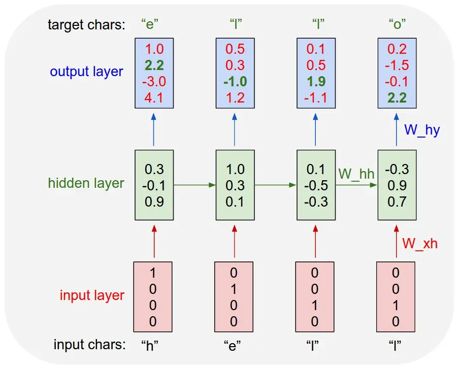 For example, we see that in the first time step when the RNN saw the character "h" it assigned confidence of 1.0 to the next letter being "h", 2.2 to letter "e", -3.0 to "l", and 4.1 to "o". Since in our training data the next correct character is "e", we would want to increase its confidence (green) and decrease the confidence of all other letters (red). The most common approach is to use a cross-entropy loss function here, which corresponds to placing a Softmax classifier on every output vector, with the correct class being the index of the next character in the sequence. Once the loss is backpropagated and the RNN's weights are updated, the correct next letters will have higher scores when faced with similar inputs. Technical add: The RNN is trained with mini-batch Stochastic Gradient Descent. I like to use RMSProp (a per-parameter adaptive learning rate) to stablilize the updates.