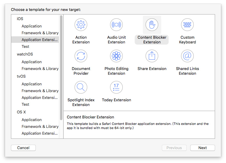 如果我们要开发一款类似 AdBlock 的应用,就需要添加一个 Extension Target,如上图。