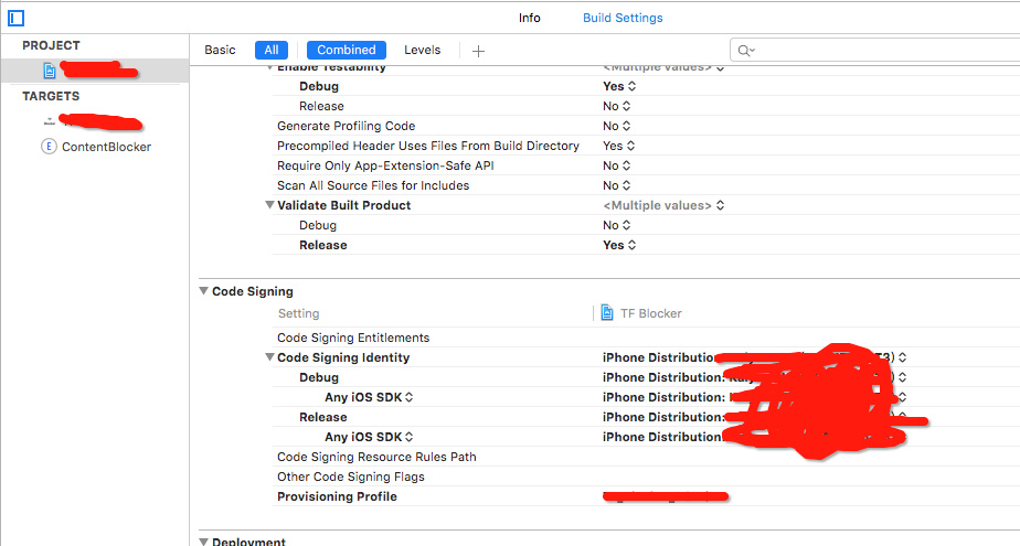 3.真正自己设置 Build Settings->Code Signing->Provisioning Profile 是要进行 Develop(测试)还是 Distribution(打包),在 PROJECT 那里设置:
