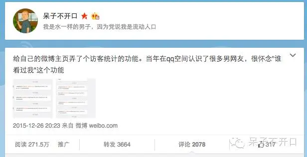 所以当我在用微博的时候,我就在想要不要给微博加个访客统计的功能。后来实现了,见下图