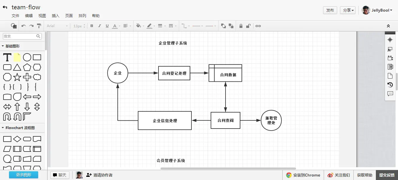 产品经理必备的协作画图的产品,ProcessOn[5]是国内目前做得比较好的在线作图协作平台,像流程图,图表式的Roadmap等,既然我们的重心是在产品上,那么我向你推荐ProcessOn,它可以快速地制作出你想要的各种图。而且,ProcessOn还支持协作画图,你可以跟你的小伙伴们一边作图,一边沟通交流。