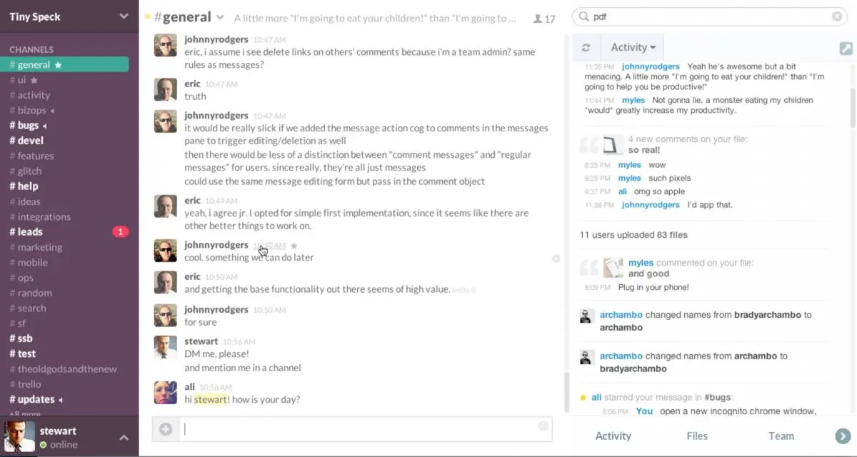 可以对团队成员以及各成员分享的文件,文档进行搜索。你可以创建一些基于你们需要讨论各种话题的工作和任务,也可以有专门的主题内容,如聚会,开发,设计等等。除了这些,Slack 还整合了 Twitter、Zendesk、Crashlytics 和 Heroku 等服务,将它们的通知提醒、Bug 追踪等数据融入到公司内的信息流中。让整个公司的内部交流只关注于跟工作有关的信息流,极大地提高了沟通效率。就像 Slack 的 Slogan 一样:Be less busy!