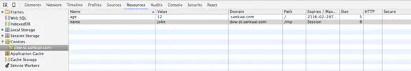 查看浏览器 cookie 面板如下图所示,cookie确实设置成功了,而且属性选项 domain、path、expires都用了默认值。