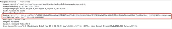 从上图中我们会看到request header中自动添加了Cookie字段(我并没有手动添加这个字段哦~),Cookie字段的值其实就是我设置的那4个 cookie。这个请求最终会发送到http://ppsc.sankuai.com这个服务器上,这个服务器就能从接收到的request header中提取那4个cookie。