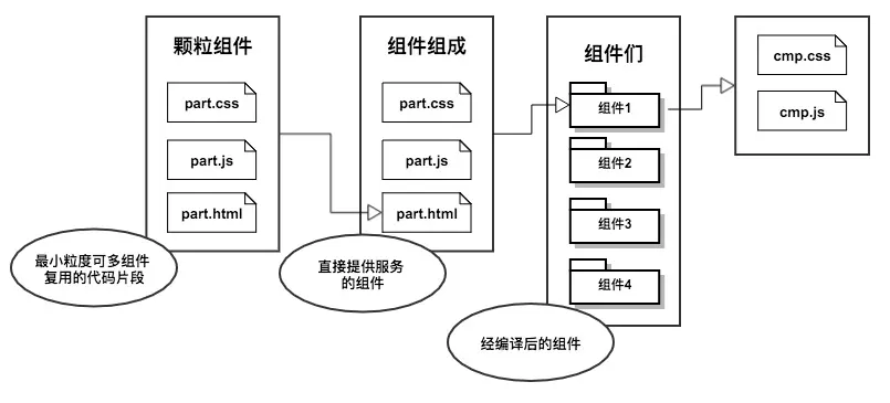 下面这张图是最初我们对组件的期望,和大多数组件化方案一致。有些区别的是增加了颗粒组件,主要用于存储可复用代码片段,节省开发成本。最终打包为一个js和css,js中包含html(模版)。而隔离了css是为了在使用中灵活的根据文件类别进行打包合并。