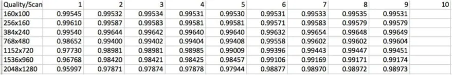 为了知道什么叫做一张令人满意的图片,我们尝试了不同的扫描层级,并最终找到了人们操作图片时涉及最多的那几个层级。我们同时也研究了不同扫描层级的图片与最终完整图片之间的相似度。我们的对比功能会获取两张图片并返还一个0到1之间的数字来表示他们的相似度。0是完全不像,1是完全一样。下面是一些测试的结果: