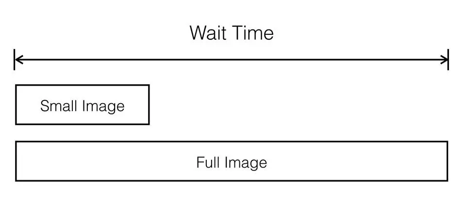 下面这张图片很好的解释了我们在 iOS 端的 Facebook 上是如何下载图片的。下面的两张图片都表示下载一张图片的情况。 “Wait Time” 表示了从显示一张图片的占位符到加载出清晰能让人表示满意的图片所需要的时间。即使当缩略图片已经显示了,许多用户还是不愿再等待全图的加载。