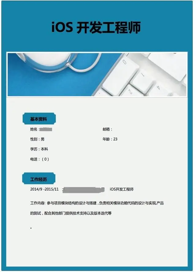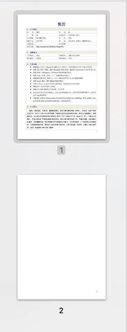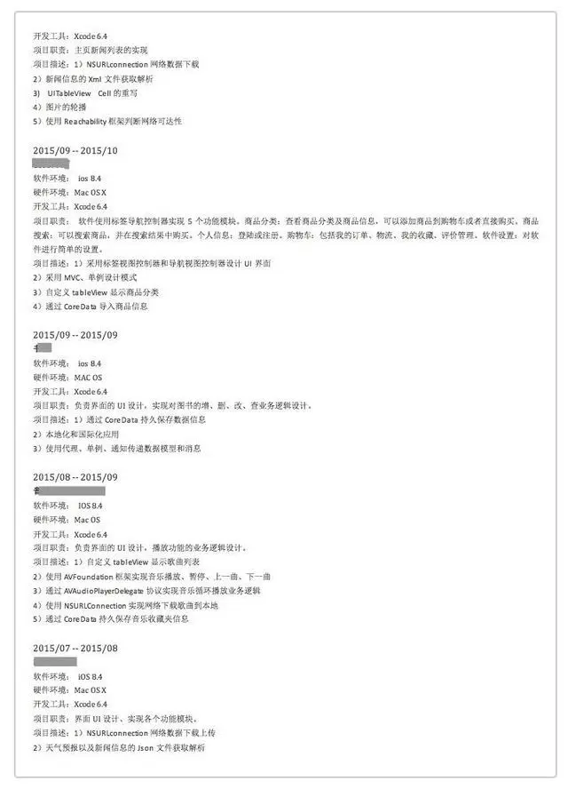 像这份简历已经达到了6页之多,并且光是个人技能已经满满一页了,其实是像Xib,XML / JSON 解析,第三方类库使用等等是可以直接写到项目经验里去的,个人技术只挑具有代表性的内容即可。