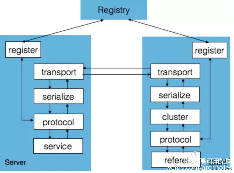 在进行 RPC 请求时,Client 通过代理机制调用 cluster 模块,cluster 根据配置的 HA 和 LoadBalance 选出一个可用的 Server,通过 serialize 模块把 RPC 请求转换为字节流,然后通过 transport 模块发送到 Server 端。