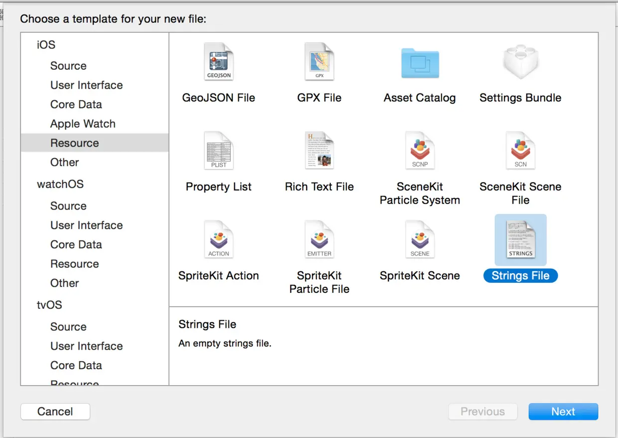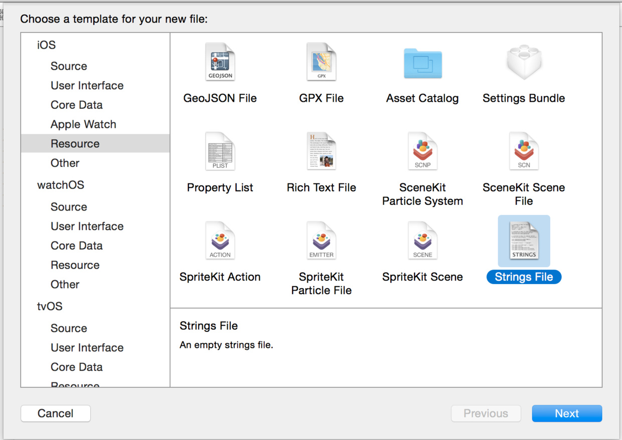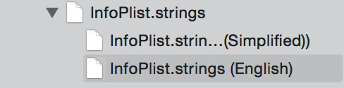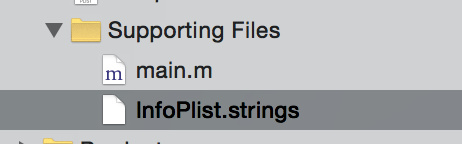 - 1.同添加InfoPlist.strings的做法相同,添加一个Localizable.strings文件