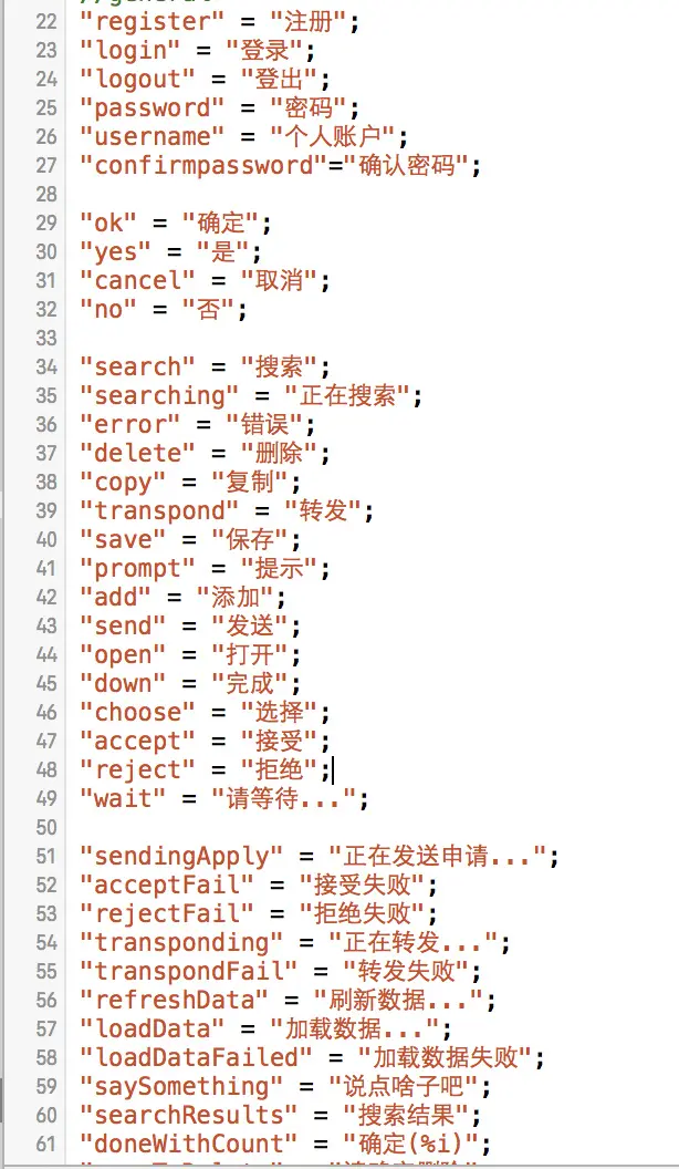 关于上述的key和value,只是示范,可自行定义,调用这些key-value需要利用NSLocalizedString(<#key#>, <#comment#>)系统宏,例如:NSLocalizedString(@"alertTitle", @"这是一句注解,根据情况写"),第一个参数即在strings文件中自定义的key,根据不同的语言环境,系统会自动检测这个key对应的value(中文还是英文),第二个参数是注释,为了便于理解,可以为nil。