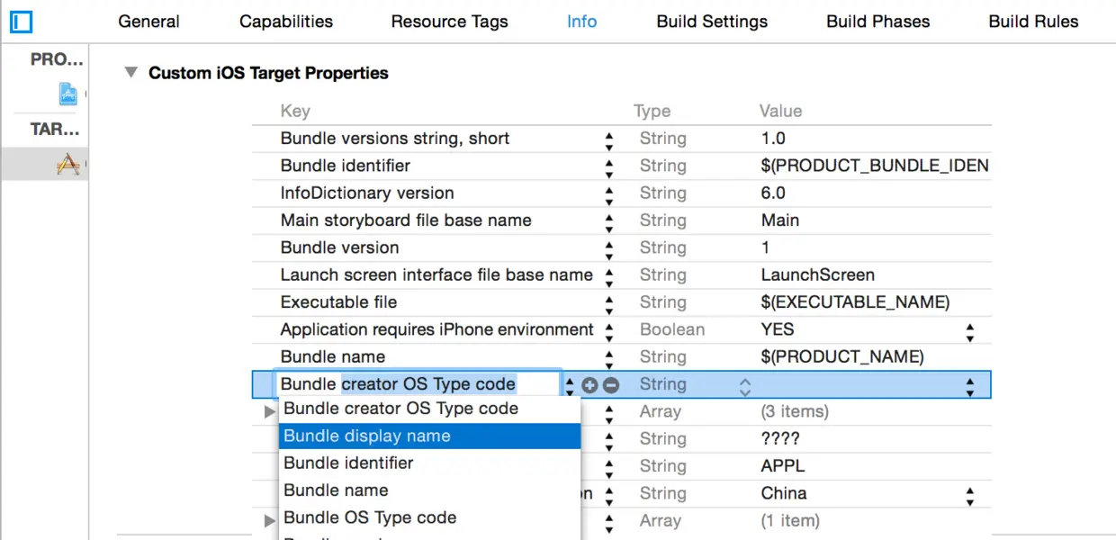 - 2.点击工程-TARGETS-Info,添加“Bundle display name”,string值填写要设置的App名称。