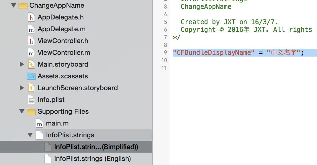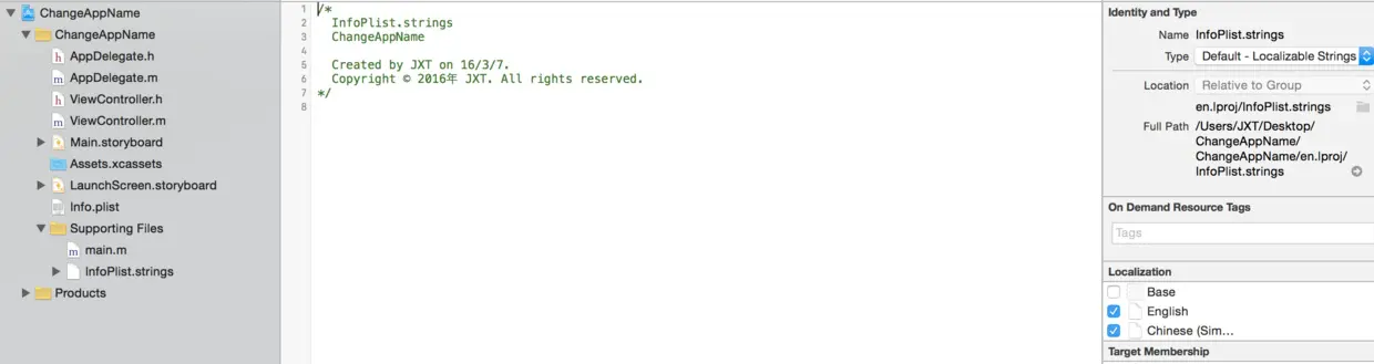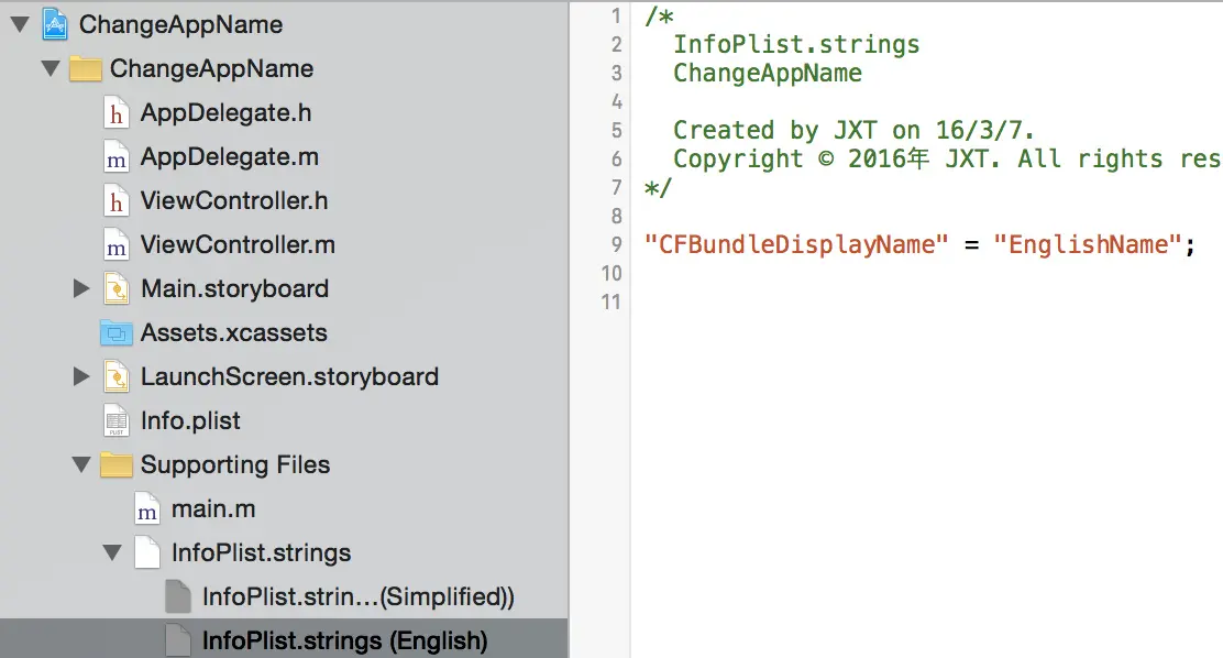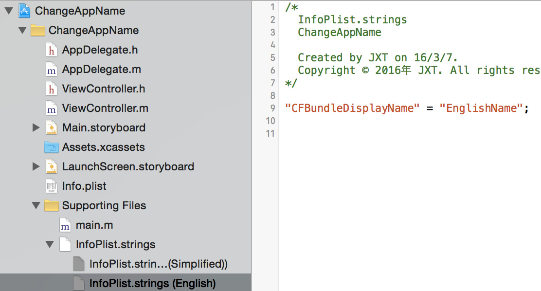 App的名字设置方式有很多种,如果在App打包上线时不做修改,最终App的名字就是Xcode在建立工程时的名字。好的习惯是工程建立时使用英文(pinyin),那么App也就是“英文”名字了,虽然Xcode也支持直接用中文命名工程(甚至是方法名……),但有时也会因此产生一些不必要的麻烦甚至莫名其妙的bug。