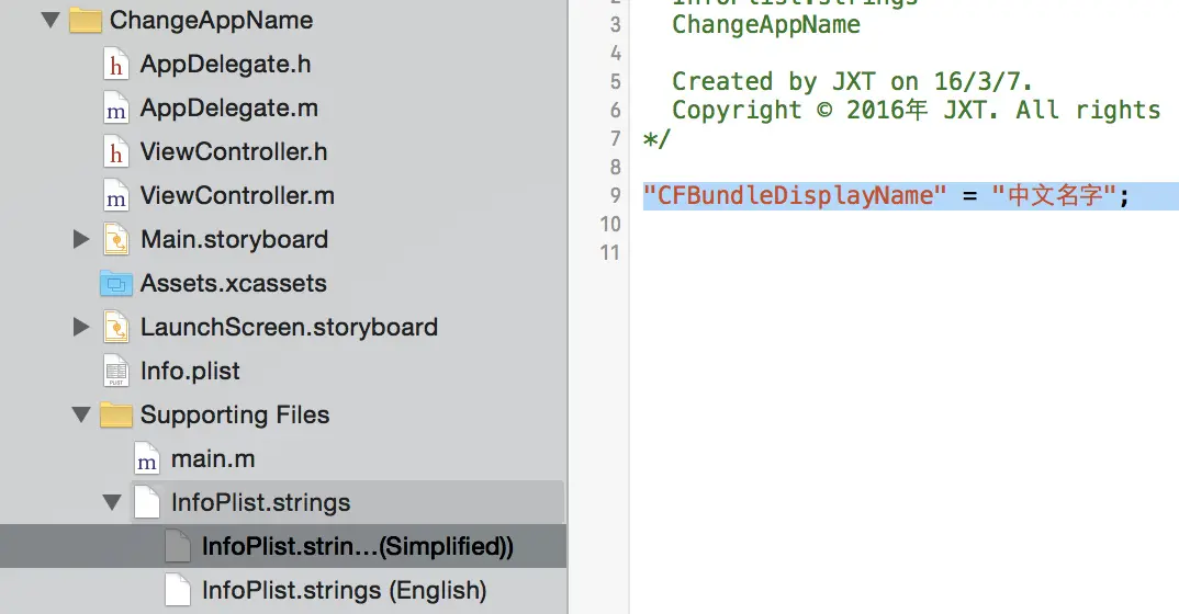 "CFBundleDisplayName" = "中文名字";"CFBundleDisplayName" = "EnglishName";