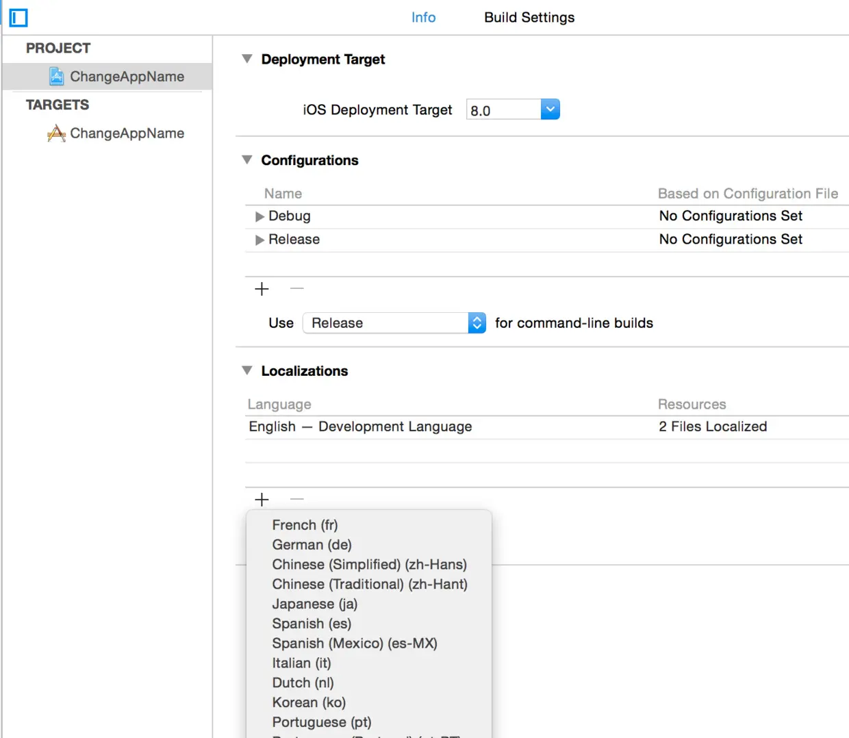 - 2.点击工程-PROJECT-Info-Localizations,添加简体中文支持,如果想支持繁体,也可继续添加,其他语言亦然。