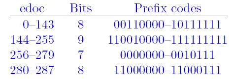 (2)上面我们分析了动态Huffman,对于LZ压缩后的literal/length/distance,也可以采用静态Huffman编码,这主要取决于ZIP在压缩中看哪种方式更节省空间,静态Huffman编码不需要记录码表,因为这个码表是固定的,在RFC1951里面也有说明。对于literal/length码表来说,需要对0-285进行编码,其码表为: