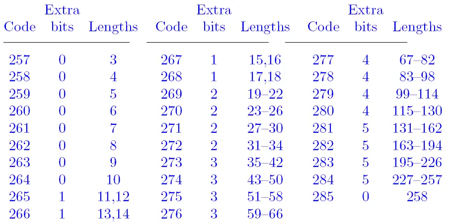 初看有点奇怪的在于,将literal和length二者合二为一,什么意思呢?就是对这两种整数(literal本质上是一个字节)共用一个Huffman码表,一会儿解释为什么。PK对Huffman的理解我觉得达到了炉火纯青的地步,前面已经看到,后面还会看到。他认为Huffman编码的输入反正说白了就是一个集合的元素就行,无论这个元素是啥,所以多个集合看做一个集合当作Huffman编码的输入没啥问题。literal用整数0-255表示,256是一个结束标志,解码以后结果是256表示解码结束;从257开始表示length,所以257这个数表示length=3,258这个数表示length=4等等,但PK也不是一直这么一一对应,和distance一样,也是把length(总共256个值)划分为29个区间,其结果如下图: