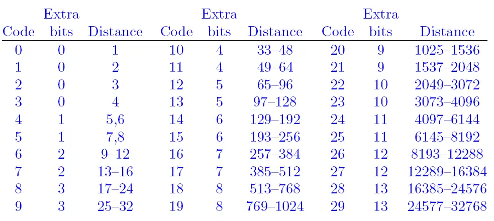 对于Distance来说,需要对Code=0-29的数进行编码,则直接采用5比特表示。Distance和动态Huffman一样,在此基础上进行扩展。