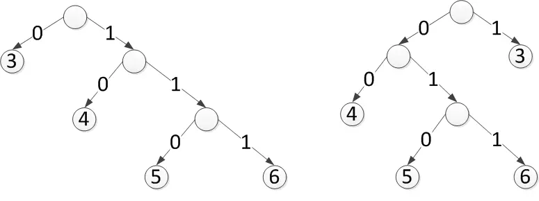 算一下,总共16个比特,果然比前面那种方式变短了。我们在前面的设计过程中,是按照这些值出现次数由高到底的顺序去找码字的,比如先确定3,再确定4、5、6等等。按照一个码字不能是另一个码字的前缀这一规则,逐步获得所有的码字。这种编码规则有一个专用术语,称为前缀码。Huffman编码基本上就是这么做的,把出现频率排个序,然后逐个去找,这个逐个去找的过程,就引入了二叉树。不过Huffman的算法一般是从频率由低到高排序,从树的下面依次往上合并,不过本质上没区别,理解思想即可。上面的结果可以用一颗二叉树表示为下图: