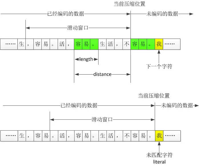 在第一个图中,“容易。”是一个重复字符串,距离distance=5,字符串长度length=3。当对这三个字符压缩完毕后,接下来滑动窗口向前移动3个字符,要压缩的是“我…”这个字符串,但这个串在滑动窗口内没找到,所以无法使用distance+length的方式记录。这种结果称为literal。literal的中文含义是原义的意思,表示没有使用distance+length的方式记录的那些普通字符。literal是不是就用原始的编码方式,比如Unicode方式表示?ZIP里不是这么做的,ZIP把literal认为也是一个数,尽管不能用distance+length表示,但不代表不可以继续压缩。另外,如果“我”出现在了滑动窗口内,是不是就可以用distance+length的方式表示?也不是,因为一个字出现重复,不值得用这种方式表示,两个字呢?distance+length就是两个整数,看起来也不一定值得,ZIP中确实认为2个字节如果在滑动窗口内找到重复,也不管,只有3个字节以上的重复字符串,才会用distance+length表示,重复字符串的长度越长越好,因为不管多长,都用distance+length表示就行了。