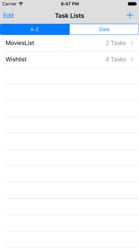 在这个工程中,我添加了两个视图控制器:TasksViewController和TaskListViewController。前面一个视图控制器是用来展示一个任务的细节,第二个视图控制器是用来显示所有的任务。在列表视图中你点击+按键添加一个任务列表。选择一个视图列表会跳转到另一个视图中添加多个任务。