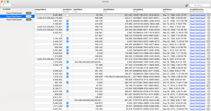 正如上图显示的,类RealmTestClass1有1000条纪录以及不同类型的参数(列)。我们会在下面接受它支持的类型。