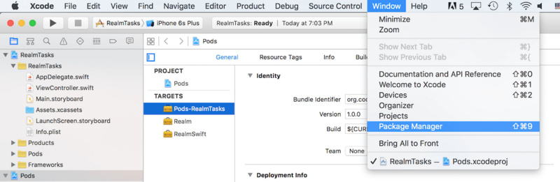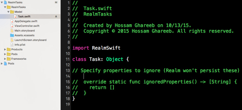 接下来运行命令"pod install"去下载安装Realm到你的工程里面。当安装完成后,你会发现文件夹下面又一个新的Xcode workspace被创建了。打开RealmTasks.xcworkspace文件,你会看见如下界面: