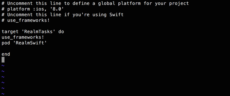 再开始配置Xcode之前请确保你已经安装了CocoaPods,我们需要使用它在Xcode工程中安装Realm。如果你对CocoaPods不熟悉的话,你可以去官网操作安装教程。
