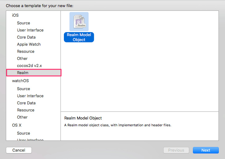 我们使用刚才安装的Realm插件创建一个Realm类。在Xcode中新建文件,在左侧选择Realm。如图: