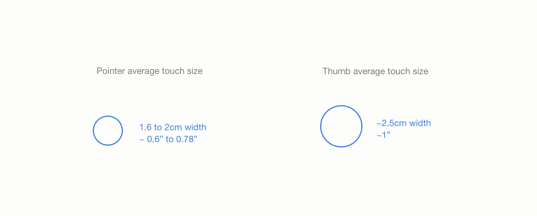 这里有交互中最常用到的两根手指(食指和大拇指)的平均大小,这代表了触摸区域和被手指遮挡了的区域。实际的触摸区域(例如,你手指接触屏幕的那部分)当然会小一点并且更准确,除非你把你的手指压在屏幕上。