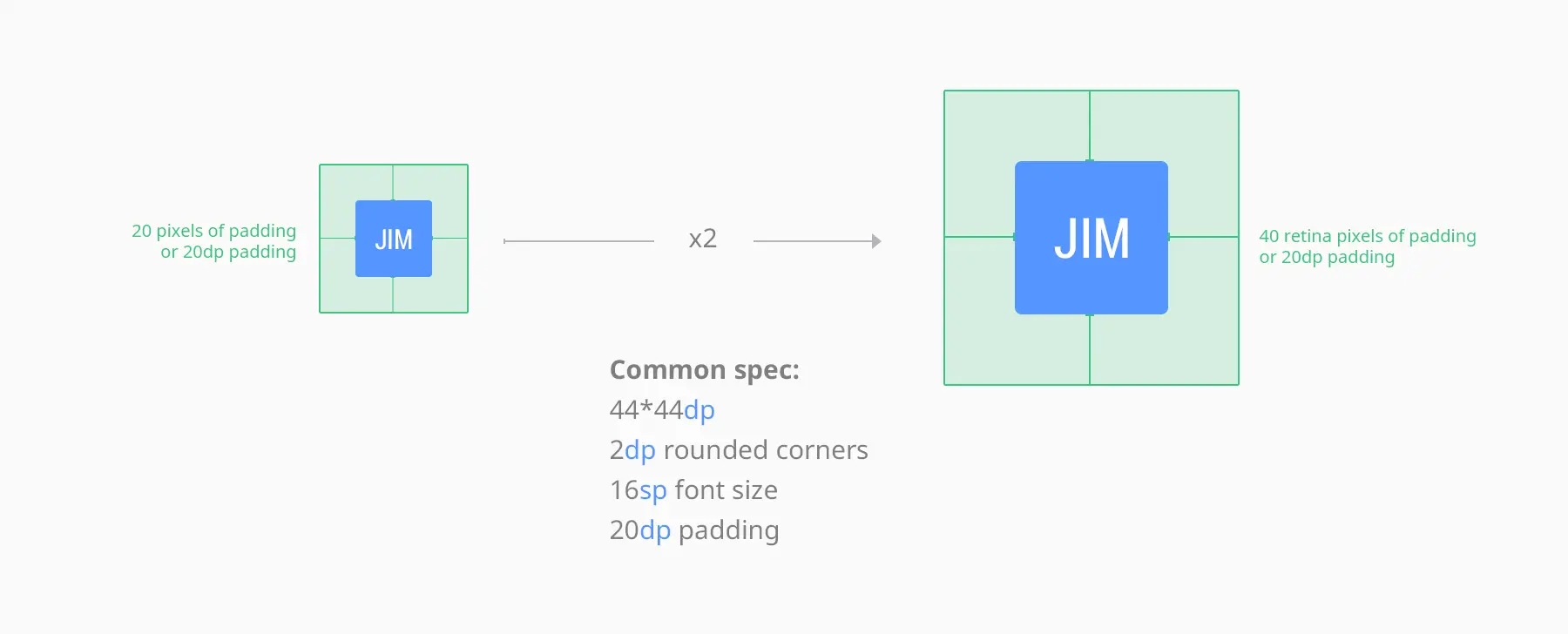 继续说前面“Jim”按钮的例子。 Jim在标准的非Retina屏幕上宽度为44px,在Retina屏幕上是88px。从技术上给Jim添加20px的padding,在Retina上padding是40px。但是,当你基于非Retina屏幕设计时计算Retina的像素值并没什么意义。