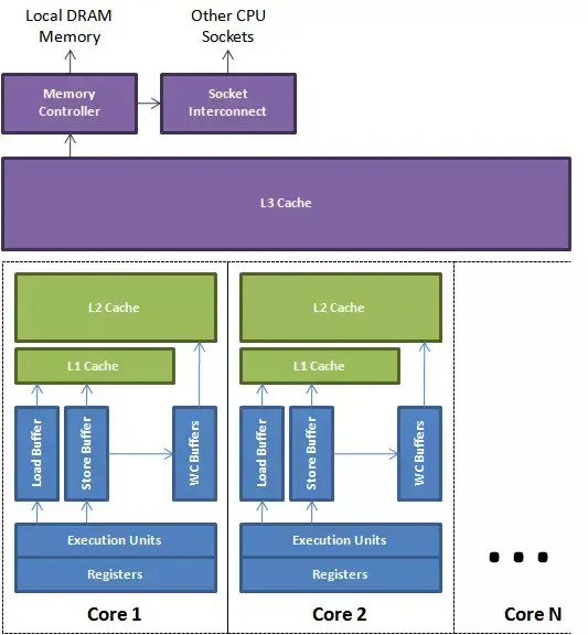 由于访问主存的延时和指令执行的延时不在一个数量级,所以CPU一般会使用访问速度更快的缓存,现代处理器的缓存一般是分为三级,下图是一般CPU的缓存结构。每一个CPU核共享L1、L2 Cache,所有的CPU核共享L3 Cache。
