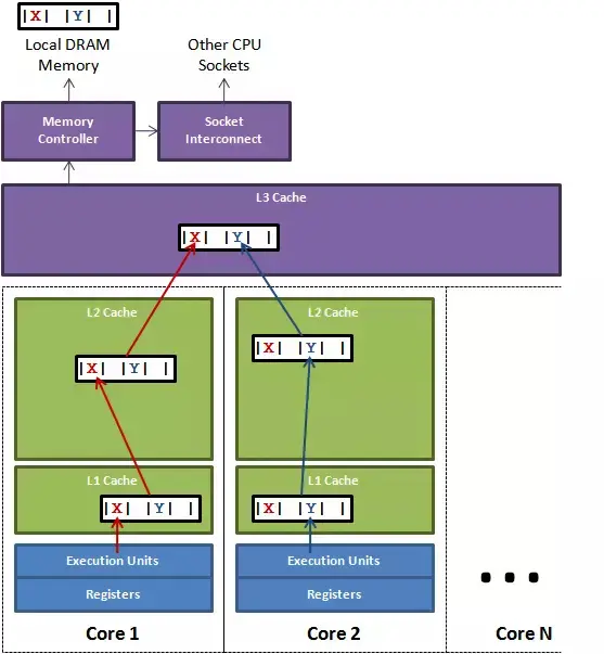 前面我讲到,内存中的数据是以cache line为单位从内存中读到CPU cache中的,比如有两个变量X,Y,在内存中他们俩非常近,那么很有可能在读X的时候,Y也被放到了相同cache line中。假设Thread1需要不停的写X,比如在一个循环中,而Thread2需要不停的写Y,那么在Thread1写X的时候,需要Invalid其他cache中对应的cache line,Thread2写Y的时候也要做同样的事情,这样就会不停的碰到上面说过的MESI协议的两个比较耗时的操作: