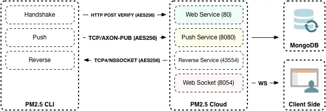 当Node进程通过PM2.5启动时,PM2.5 CLI会同云端服务进行握手,握手成功后才会源源不断的进行数据的上报。上报时首先会将数据进行AES256加密,然后使用TCP通信将数据上报到服务器,这里用到了开源的Axon,云端服务器收到数据后会将数据入库存储到MongoDB中,同时会进行监控报警的扫描,如果当前数据符合用户订阅的监控报警条件,则会通过云端的Push服务向iOS客户端推送报警信息。云端同时运行WebSocket服务,为多个终端(Web平台、iOS应用)提供实时数据的推送。