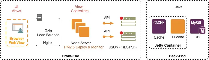 传统的开发模式只需要专注在多终端的呈现上(浏览器、WebView)。而现在,浏览器只是前端的其中一环,延伸出来的还有Node端的架构、服务的运维能力等。上图是我们目前的服务架构:Nginx位于Node服务之前,用做负载均衡、服务调度、Gzip压缩等。之后便是Node服务,我们通过PM2.5进行Node服务的Cluster部署和负载均衡(充分利用多核优势),同时作为轻量的中间层,负责路由、Controllers、Views、以及视图的渲染,数据的获取通过RESTful的API接口使用JSON格式交互。而后端则只需要负责业务逻辑、数据存储、Models,并为前端提供JSON数据即可。