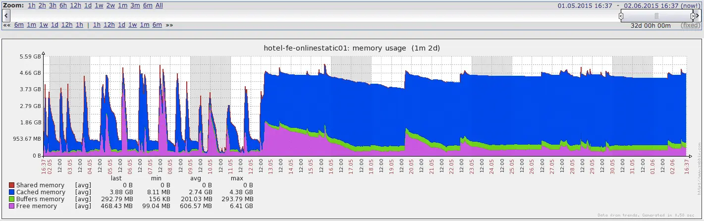 以下是我们在生产环境遭遇的一个案例:最近发现线上服务的内存占用在服务重启后会呈线性的增长,进程启动18小时后,内存就已经占用接近1.6G左右,之后不久便会超过V8的内存限制导致服务重启。从图中可以看出,在修复之前内存使用情况一直在随时间进行周期性的波动,波动的原因就是线上Node进程不断的重启导致的。