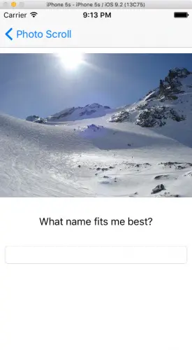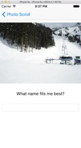 Add a Label inside of Container View below the image view. Specify the label’s text as: What name fits me best? Add a centered horizontal constraint to Container View. Add a vertical spacing constraint of 0 with Photo View.