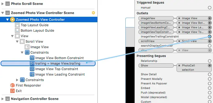 Back in Main.storyboard, wire up the Scroll View to the Zoomed View Controller by attaching it to the scrollView outlet and setting Zoomed View Controller as the Scroll View’s delegate. Also, connect the new constraint outlets from Zoomed View Controller to the appropriate constraints in the Document Outline like this: