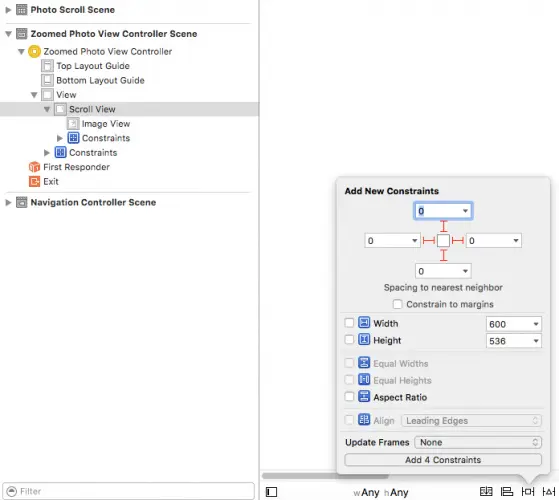 Resolve the Auto Layout warning by selecting Zoomed Photo View Controller in Document Outline, and then selecting Editor\Resolve Auto Layout Issues\Update Frames.