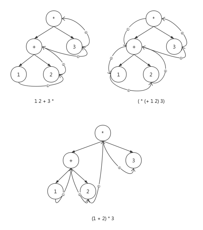 可以看出,对于这三种简单的语言,它们只是在这个语法树上按不同的规则遍历而已。三者的代码看起来差别很大,但实际上所用的树结构是相同的。