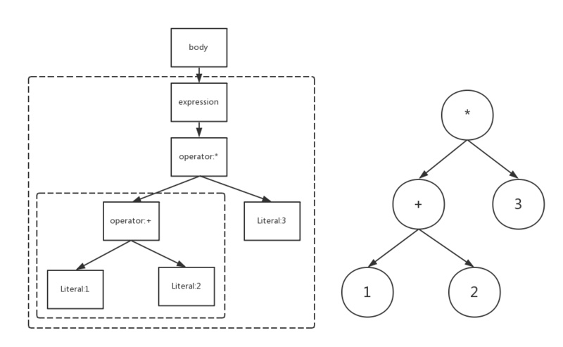 如果还没有看懂,你可以到这里看一下这段代码所生成的语法树:AST for (1 + 2)* 3;*%203%0A)