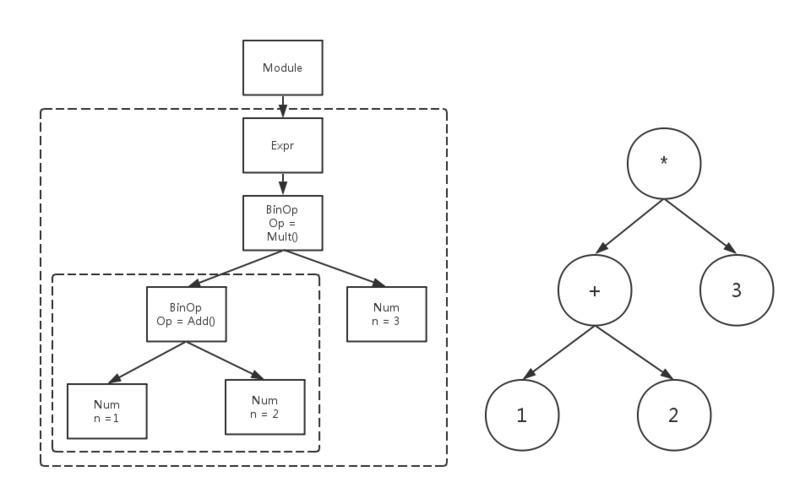 通过Python语言自带的库文件ast,我们可以查看特定的代码被转换成怎样的语法树。